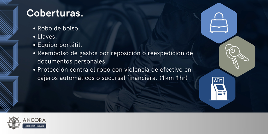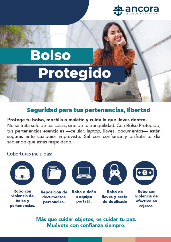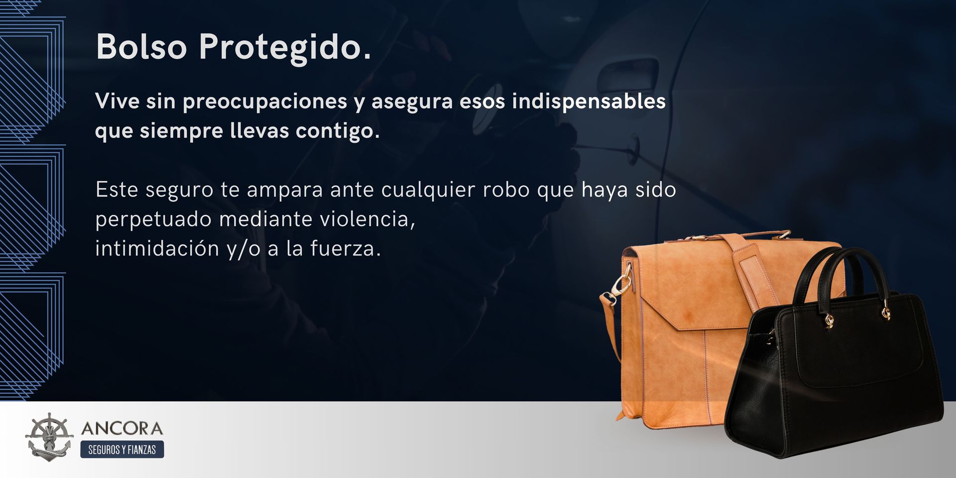 Es un seguro que protege tu bolso y los objetos personales que llevas dentro en caso de robo con violencia, siempre que el evento ocurra dentro de la vigencia de la póliza y en la República Mexicana.